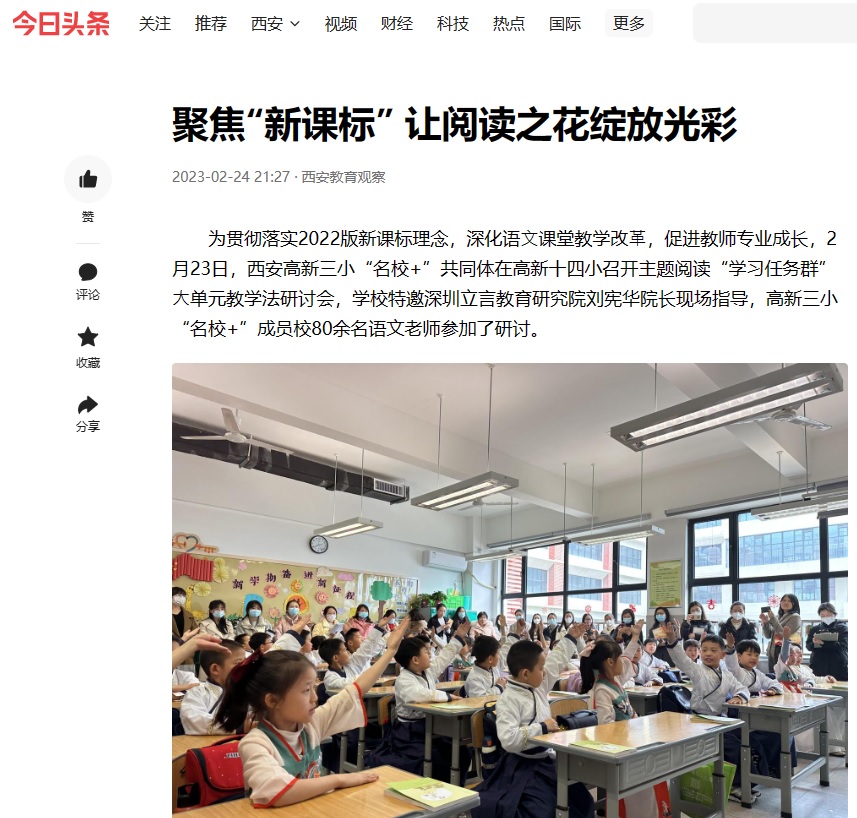在新课标落地任务群实施的大主题、大情境背景下,师生共读、生生共读、亲子共读已成为常态。据了解,高新十四小自建校以来,一直开展“书式生活,书香人生”读书课程。通过每周二、周四的午读,每月的读书争章,每年四月读书节活动的开展,学生课后服务时间走进“启梦图书馆”,“金钥匙正能量”“小主人大讲堂”等一系列读书分享,使每个学生的识字量、诵读诗文量明显增加,语文素养不断提升。