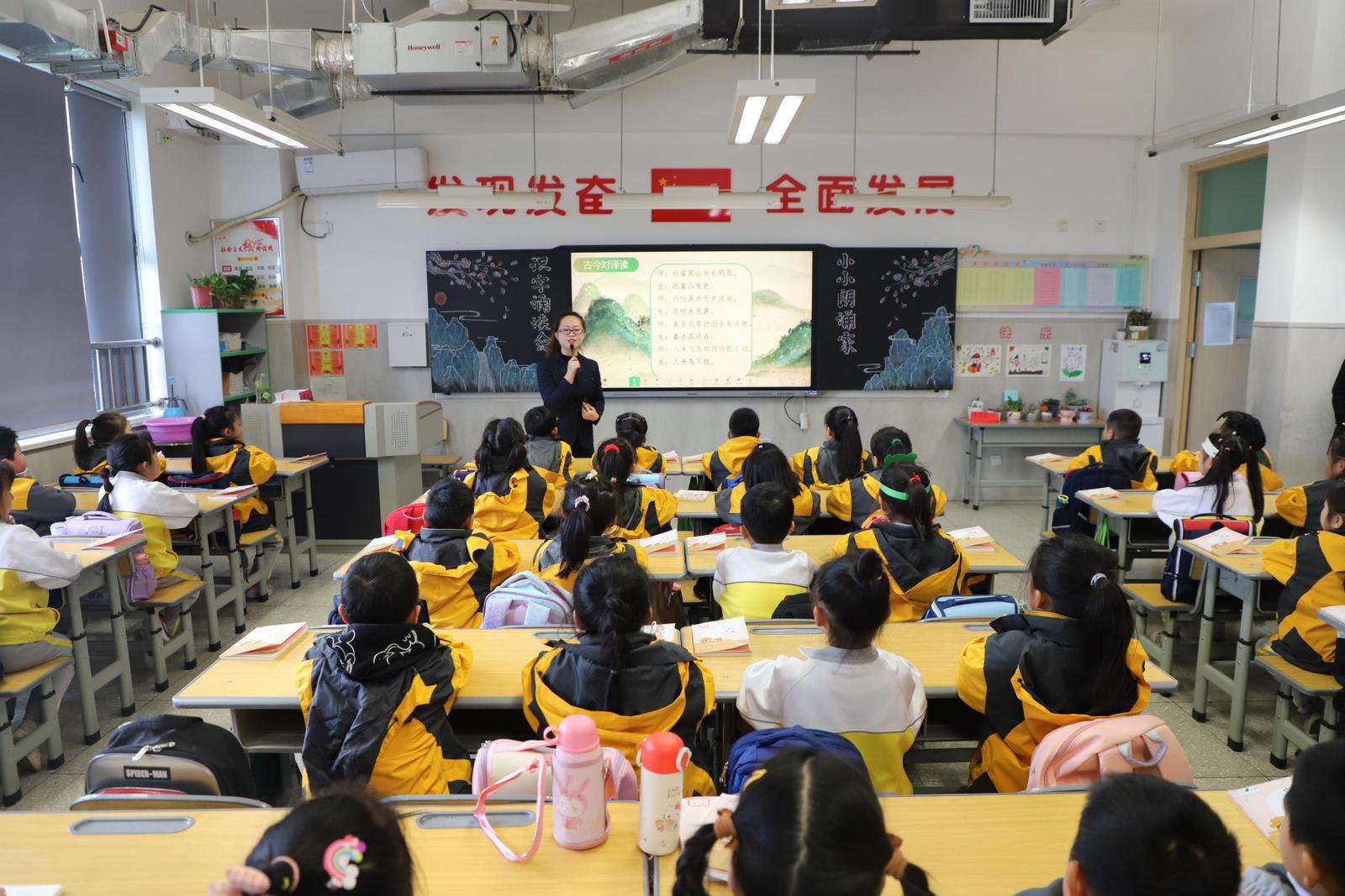 在大情境创设下,高新十四小杨瑾、郭映蕊老师围绕主题诗会,带领孩子们或古今对译读,或情境赏析读,或你问我答读,或趣味表演读,稚嫩的诵读声直击人心,给与会老师呈现了两节诗意的课堂。